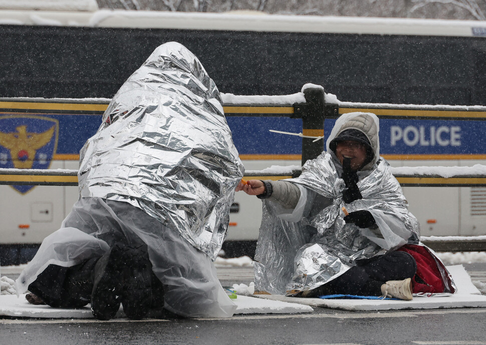 한겨레 : 서울 전 지역에 대설주의보가 내려진 5일 오전 서울 용산구 관저 인근 ‘노동자 시민 윤석열 체포대회’ 농성장에서 시민들이 소세지를 나눠먹고 있다. 김혜윤 기자 unique@hani.co.kr